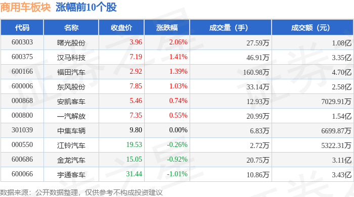 从资金流向上来看,当日商用车板块主力资金净流出3.6亿元,游资资金净流入9909.89万元,散户资金净流入2.61亿元。商用车板块个股资金流向见下表:
