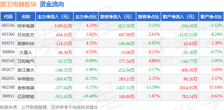 从资金流向上来看,当日厨卫电器板块主力资金净流出173.17万元,游资资金净流出1348.21万元,散户资金净流入1521.38万元。厨卫电器板块个股资金流向见下表: