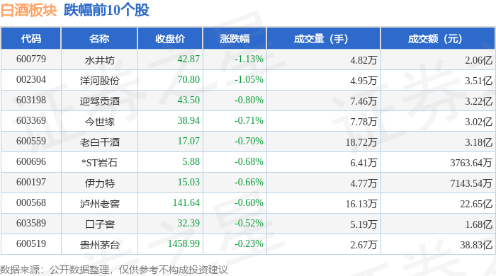 证券之星消息,11月11日白酒板块较上一交易日下跌0.18%,水井坊领跌。当日上证指数报收于4002.76,下跌0.39%。深证成指报收于13289.0,下跌1.03%。白酒板块个股涨跌见下表: