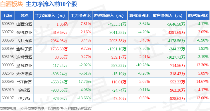 从资金流向上来看,当日白酒板块主力资金净流出4.97亿元,游资资金净流入2.54亿元,散户资金净流入2.44亿元。白酒板块个股资金流向见下表: