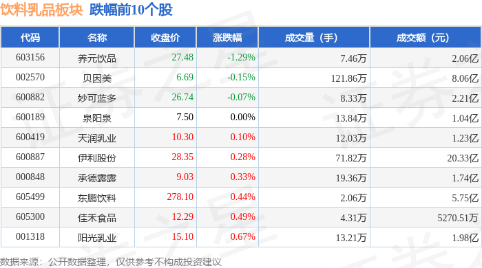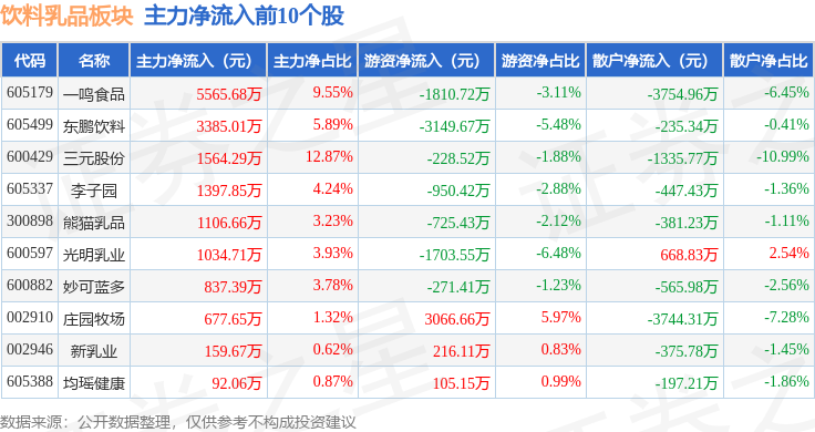 从资金流向上来看,当日饮料乳品板块主力资金净流出1.27亿元,游资资金净流出2876.04万元,散户资金净流入1.55亿元。饮料乳品板块个股资金流向见下表: