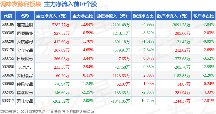 从资金流向上来看,当日调味发酵品板块主力资金净流入1965.36万元,游资资金净流出4304.08万元,散户资金净流入2338.71万元。调味发酵品板块个股资金流向见下表: