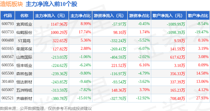 从资金流向上来看,当日造纸板块主力资金净流出3.54亿元,游资资金净流入87.46万元,散户资金净流入3.53亿元。造纸板块个股资金流向见下表:
