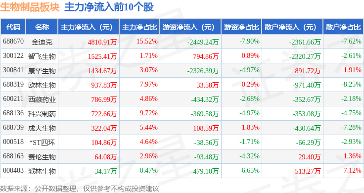 从资金流向上来看,当日生物制品板块主力资金净流出6.71亿元,游资资金净流入3.37亿元,散户资金净流入3.35亿元。生物制品板块个股资金流向见下表:
