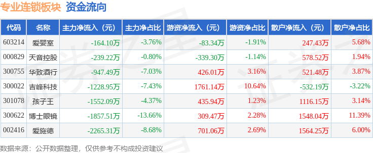 从资金流向上来看,当日专业连锁板块主力资金净流出8254.67万元,游资资金净流入3210.99万元,散户资金净流入5043.68万元。专业连锁板块个股资金流向见下表: