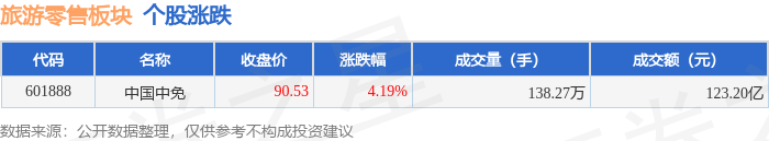 证券之星消息,11月11日旅游零售板块较上一交易日上涨4.19%,中国中免领涨。当日上证指数报收于4002.76,下跌0.39%。深证成指报收于13289.0,下跌1.03%。旅游零售板块个股涨跌见下表: