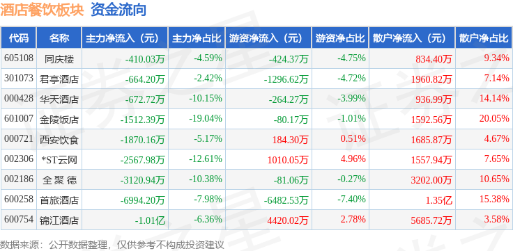 从资金流向上来看,当日酒店餐饮板块主力资金净流出2.79亿元,游资资金净流出3014.66万元,散户资金净流入3.09亿元。酒店餐饮板块个股资金流向见下表: