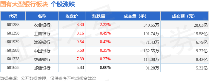 证券之星消息,11月11日国有大型银行板块较上一交易日上涨1.1%,农业银行领涨。当日上证指数报收于4002.76,下跌0.39%。深证成指报收于13289.0,下跌1.03%。国有大型银行板块个股涨跌见下表: