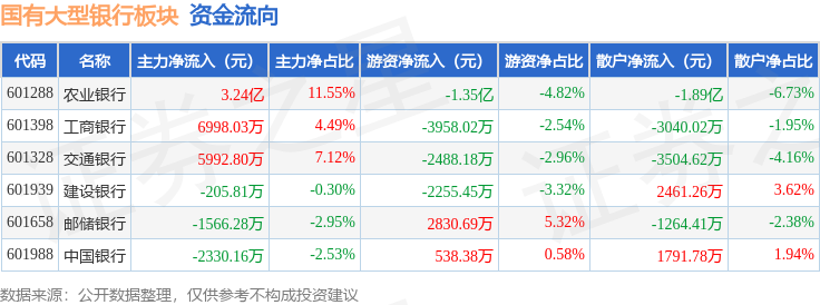 从资金流向上来看,当日国有大型银行板块主力资金净流入4.13亿元,游资资金净流出1.88亿元,散户资金净流出2.24亿元。国有大型银行板块个股资金流向见下表: