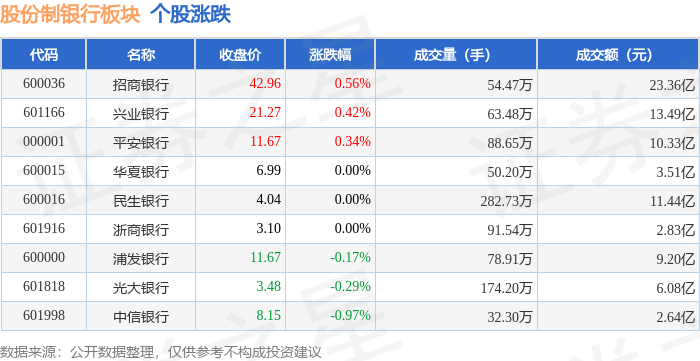 证券之星消息,11月11日股份制银行板块较上一交易日上涨0.12%,招商银行领涨。当日上证指数报收于4002.76,下跌0.39%。深证成指报收于13289.0,下跌1.03%。股份制银行板块个股涨跌见下表: