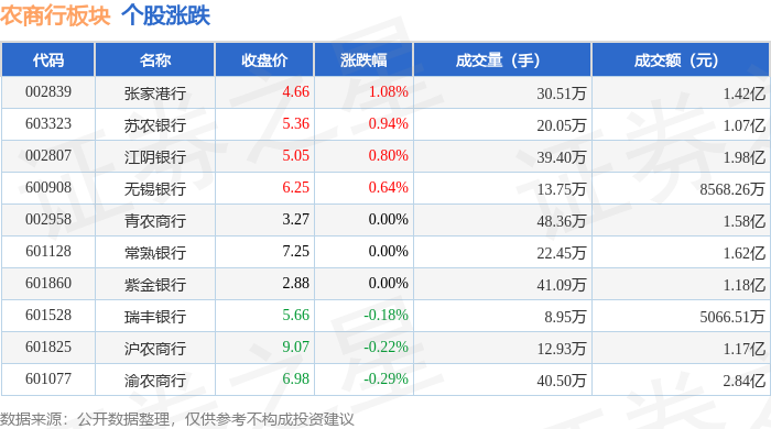 证券之星消息,11月11日农商行板块较上一交易日上涨0.01%,张家港行领涨。当日上证指数报收于4002.76,下跌0.39%。深证成指报收于13289.0,下跌1.03%。农商行板块个股涨跌见下表:
