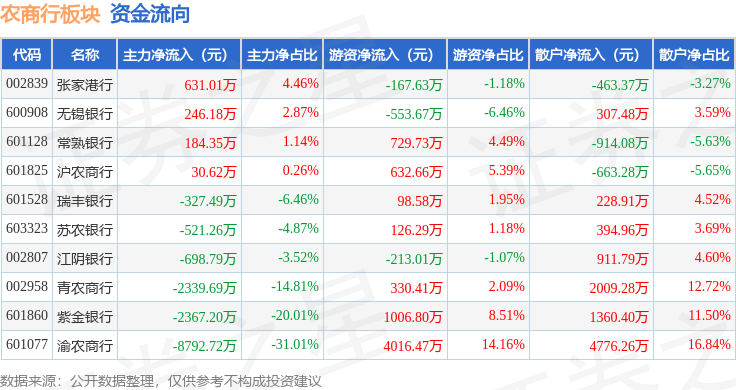 从资金流向上来看,当日农商行板块主力资金净流出1.4亿元,游资资金净流入6006.64万元,散户资金净流入7948.35万元。农商行板块个股资金流向见下表: