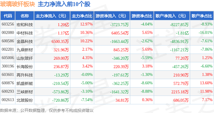 从资金流向上来看,当日玻璃玻纤板块主力资金净流入1.9亿元,游资资金净流出4.55万元,散户资金净流出1.9亿元。玻璃玻纤板块个股资金流向见下表: