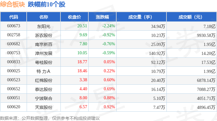 证券之星消息,11月11日综合板块较上一交易日下跌0.32%,东阳光领跌。当日上证指数报收于4002.76,下跌0.39%。深证成指报收于13289.0,下跌1.03%。综合板块个股涨跌见下表: