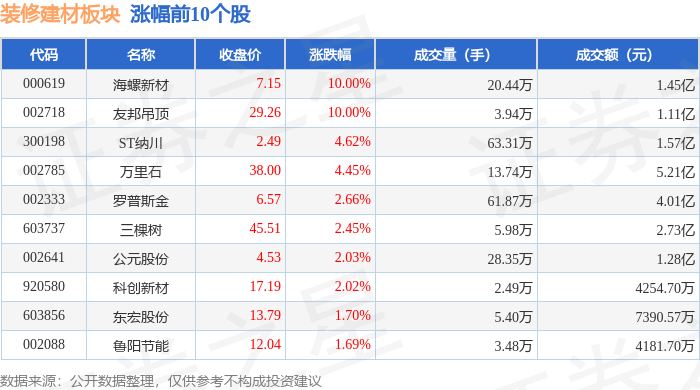 证券之星消息,11月11日装修建材板块较上一交易日上涨0.57%,海螺新材领涨。当日上证指数报收于4002.76,下跌0.39%。深证成指报收于13289.0,下跌1.03%。装修建材板块个股涨跌见下表:
