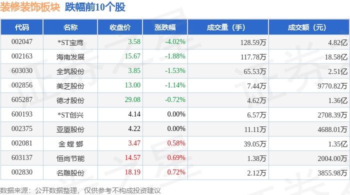 证券之星消息,11月11日装修装饰板块较上一交易日上涨0.83%,*ST东易领涨。当日上证指数报收于4002.76,下跌0.39%。深证成指报收于13289.0,下跌1.03%。装修装饰板块个股涨跌见下表: