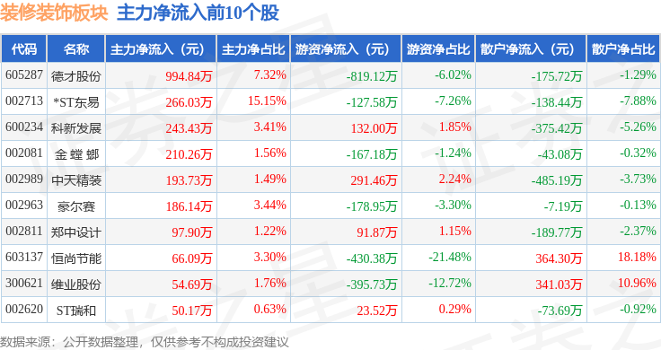 从资金流向上来看,当日装修装饰板块主力资金净流出1.9亿元,游资资金净流出3656.54万元,散户资金净流入2.26亿元。装修装饰板块个股资金流向见下表: