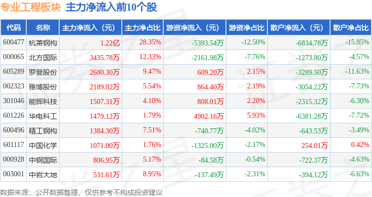 从资金流向上来看,当日专业工程板块主力资金净流出2.68亿元,游资资金净流入1.4亿元,散户资金净流入1.29亿元。专业工程板块个股资金流向见下表: