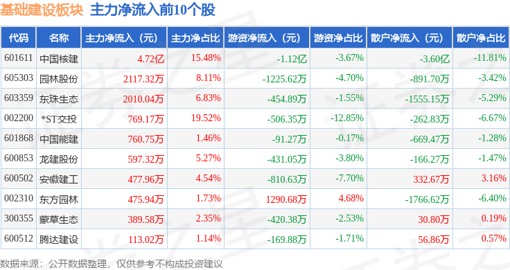 从资金流向上来看,当日基础建设板块主力资金净流入1.56亿元,游资资金净流出1.99亿元,散户资金净流入4242.91万元。基础建设板块个股资金流向见下表: