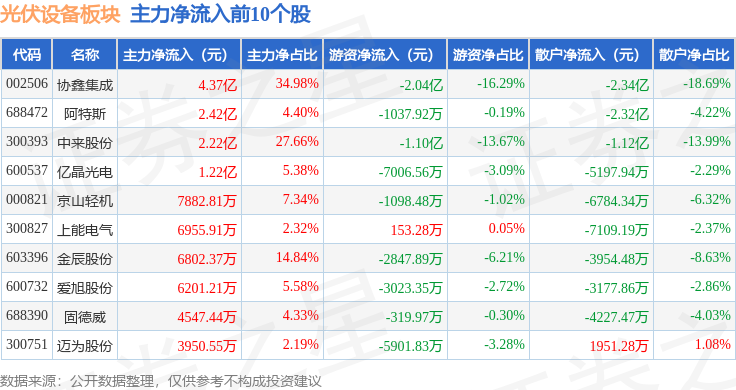 从资金流向上来看,当日光伏设备板块主力资金净流出1.3亿元,游资资金净流入2.06亿元,散户资金净流出7626.08万元。光伏设备板块个股资金流向见下表: