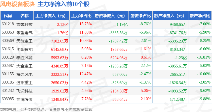 从资金流向上来看,当日风电设备板块主力资金净流入3.66亿元,游资资金净流出3174.6万元,散户资金净流出3.34亿元。风电设备板块个股资金流向见下表: