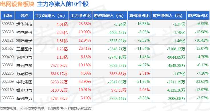 从资金流向上来看,当日电网设备板块主力资金净流出31.43亿元,游资资金净流入7.22亿元,散户资金净流入24.21亿元。电网设备板块个股资金流向见下表: