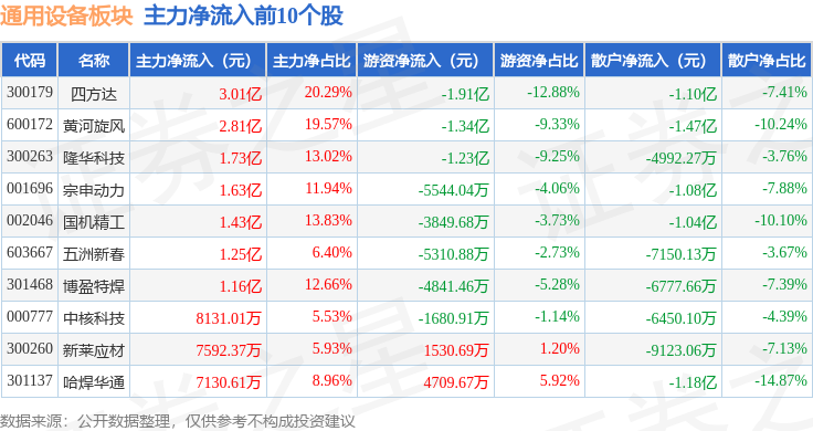 从资金流向上来看,当日通用设备板块主力资金净流入1.24亿元,游资资金净流出2.3亿元,散户资金净流入1.06亿元。通用设备板块个股资金流向见下表: