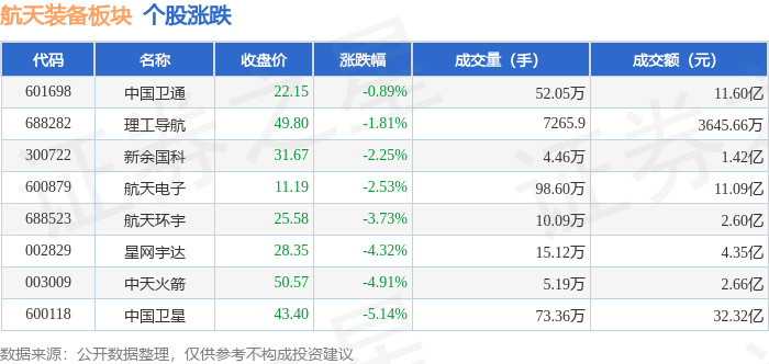 证券之星消息,11月11日航天装备板块较上一交易日下跌2.58%,中国卫星领跌。当日上证指数报收于4002.76,下跌0.39%。深证成指报收于13289.0,下跌1.03%。航天装备板块个股涨跌见下表: