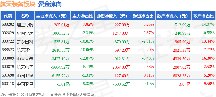 从资金流向上来看,当日航天装备板块主力资金净流出5.02亿元,游资资金净流入3175.35万元,散户资金净流入4.71亿元。航天装备板块个股资金流向见下表: