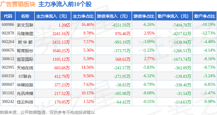 从资金流向上来看,当日广告营销板块主力资金净流出6.79亿元,游资资金净流入6174.97万元,散户资金净流入6.17亿元。广告营销板块个股资金流向见下表: