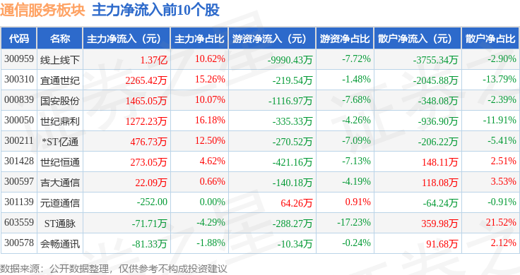 从资金流向上来看,当日通信服务板块主力资金净流出7.35亿元,游资资金净流入1.05亿元,散户资金净流入6.3亿元。通信服务板块个股资金流向见下表: