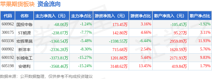 从资金流向上来看,当日苹果期货板块主力资金净流出1.09亿元,游资资金净流入3783.89万元,散户资金净流入7161.28万元。苹果期货板块个股资金流向见下表:
