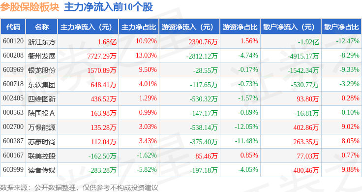 从资金流向上来看,当日参股保险板块主力资金净流出10.12亿元,游资资金净流入2.56亿元,散户资金净流入7.56亿元。参股保险板块个股资金流向见下表: