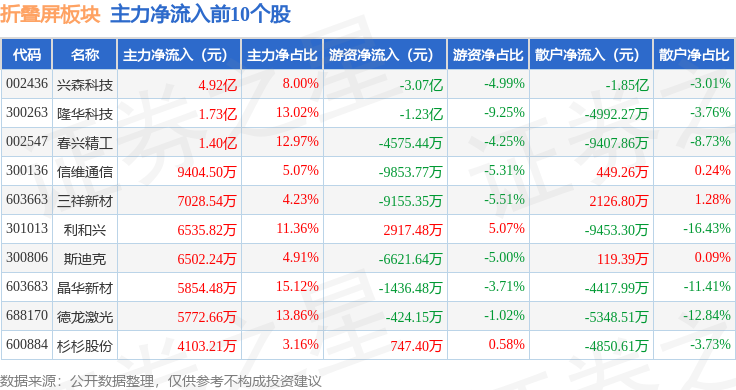 从资金流向上来看,当日折叠屏板块主力资金净流出24.83亿元,游资资金净流入2.26亿元,散户资金净流入22.58亿元。折叠屏板块个股资金流向见下表:
