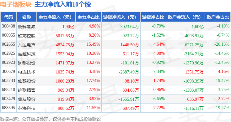 从资金流向上来看,当日电子烟板块主力资金净流出21.36亿元,游资资金净流入2.83亿元,散户资金净流入18.53亿元。电子烟板块个股资金流向见下表: