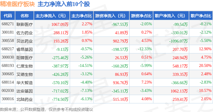 从资金流向上来看,当日精准医疗板块主力资金净流出4.75亿元,游资资金净流入9122.11万元,散户资金净流入3.83亿元。精准医疗板块个股资金流向见下表: