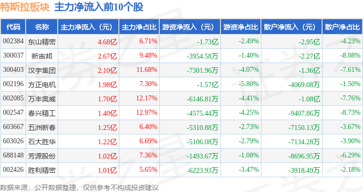 从资金流向上来看,当日特斯拉板块主力资金净流出63.46亿元,游资资金净流出9257.78万元,散户资金净流入64.39亿元。特斯拉板块个股资金流向见下表: