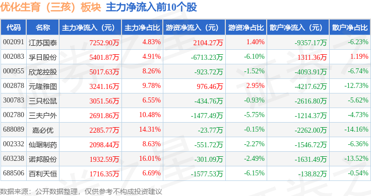 从资金流向上来看,当日优化生育(三孩)板块主力资金净流出8.71亿元,游资资金净流出1.19亿元,散户资金净流入9.91亿元。优化生育(三孩)板块个股资金流向见下表: