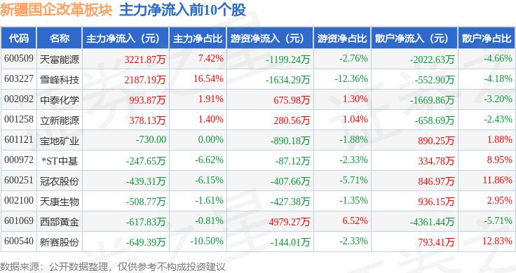 从资金流向上来看,当日新疆国企改革板块主力资金净流出1.95亿元,游资资金净流入813.71万元,散户资金净流入1.86亿元。新疆国企改革板块个股资金流向见下表: