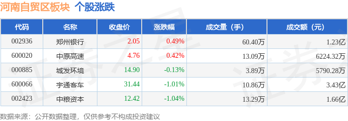 证券之星消息,11月11日河南自贸区板块较上一交易日下跌0.68%,中粮资本领跌。当日上证指数报收于4002.76,下跌0.39%。深证成指报收于13289.0,下跌1.03%。河南自贸区板块个股涨跌见下表: