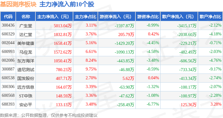 从资金流向上来看,当日基因测序板块主力资金净流出4.1亿元,游资资金净流入3877.68万元,散户资金净流入3.71亿元。基因测序板块个股资金流向见下表: