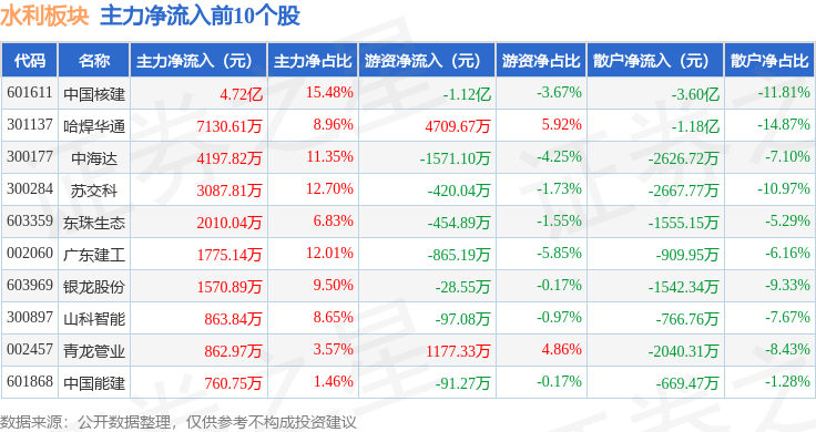 从资金流向上来看,当日水利板块主力资金净流出3498.83万元,游资资金净流出7443.8万元,散户资金净流入1.09亿元。水利板块个股资金流向见下表: