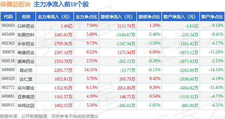 从资金流向上来看,当日保健品板块主力资金净流出4.62亿元,游资资金净流入1.06亿元,散户资金净流入3.56亿元。保健品板块个股资金流向见下表: