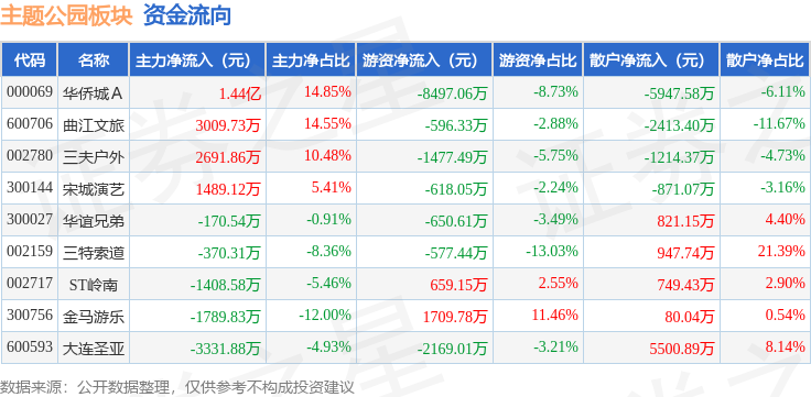 从资金流向上来看,当日主题公园板块主力资金净流入1.46亿元,游资资金净流出1.22亿元,散户资金净流出2347.17万元。主题公园板块个股资金流向见下表: