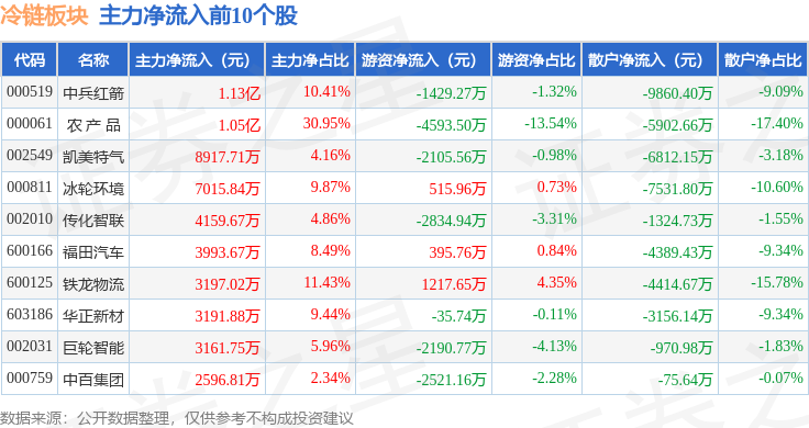 从资金流向上来看,当日冷链板块主力资金净流出10.44亿元,游资资金净流出1.69亿元,散户资金净流入12.13亿元。冷链板块个股资金流向见下表: