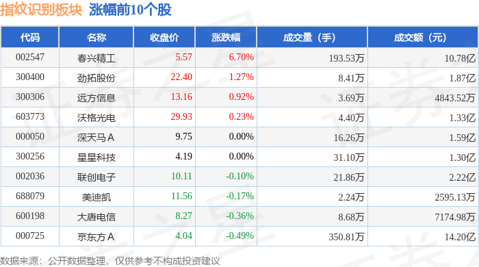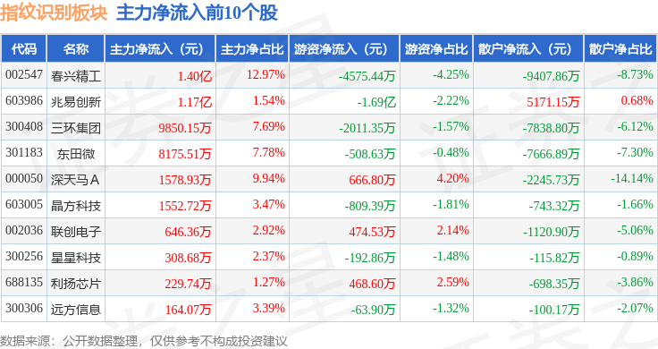从资金流向上来看,当日指纹识别板块主力资金净流出5.48亿元,游资资金净流入2409.78万元,散户资金净流入5.24亿元。指纹识别板块个股资金流向见下表: