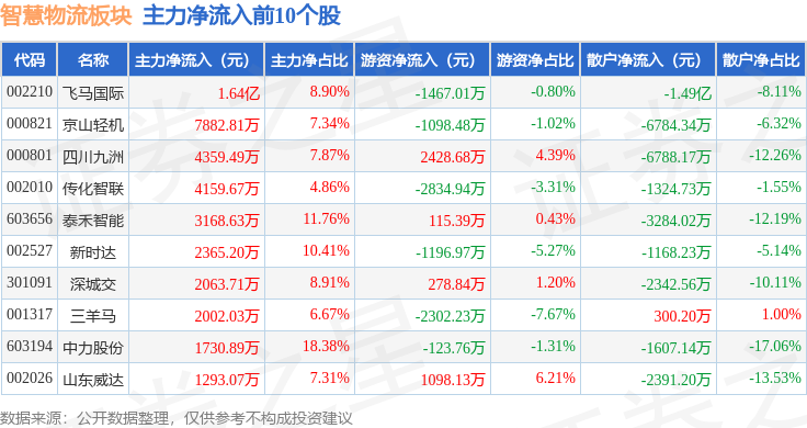 从资金流向上来看,当日智慧物流板块主力资金净流出6.96亿元,游资资金净流入3.23亿元,散户资金净流入3.73亿元。智慧物流板块个股资金流向见下表: