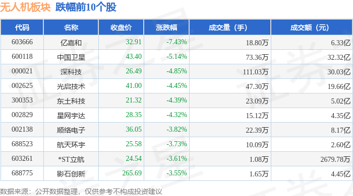 证券之星消息,11月11日无人机板块较上一交易日下跌1.05%,亿嘉和领跌。当日上证指数报收于4002.76,下跌0.39%。深证成指报收于13289.0,下跌1.03%。无人机板块个股涨跌见下表: