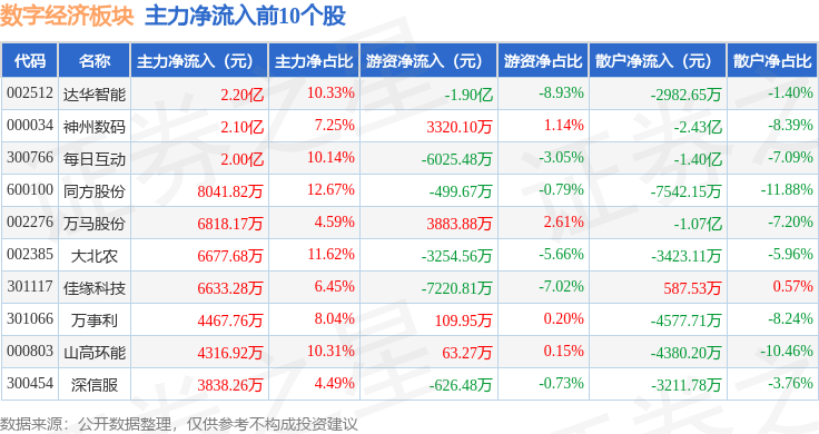 从资金流向上来看,当日数字经济板块主力资金净流出83.24亿元,游资资金净流入16.74亿元,散户资金净流入66.5亿元。数字经济板块个股资金流向见下表: