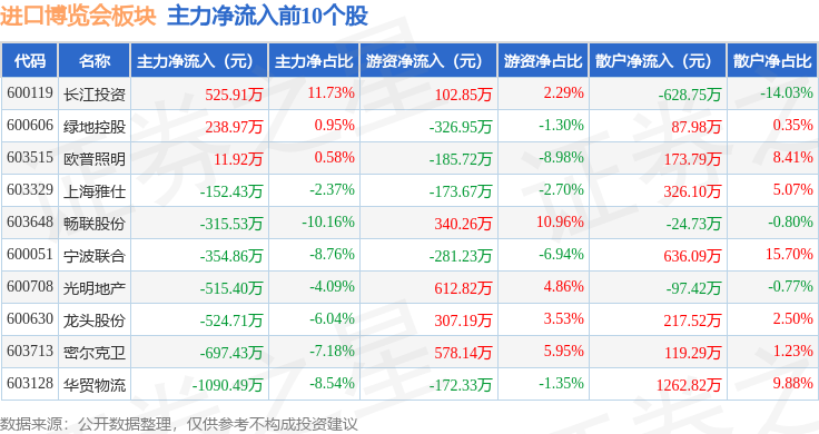 从资金流向上来看,当日进口博览会板块主力资金净流出8585.26万元,游资资金净流入2647.91万元,散户资金净流入5937.35万元。进口博览会板块个股资金流向见下表: